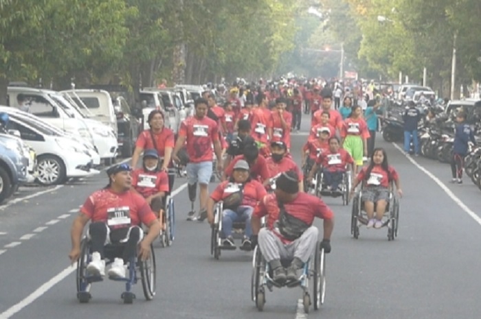 BALI – Sebanyak 76 orang kaum disabilitas di Bali mengikuti jalan santai di kawasan Renon Kota Denpasar pada Minggu pagi tadi. Kaum disabilitas ini datang ke kawasan Renon Denpasar dengan menggunakan kendaraan roda empat. Bersama keluarga, setibanya di Renon mereka menggunakan kursi roda yang biasa mereka gunakan untuk beraktifitas sehari-hari untuk berjalan santai.