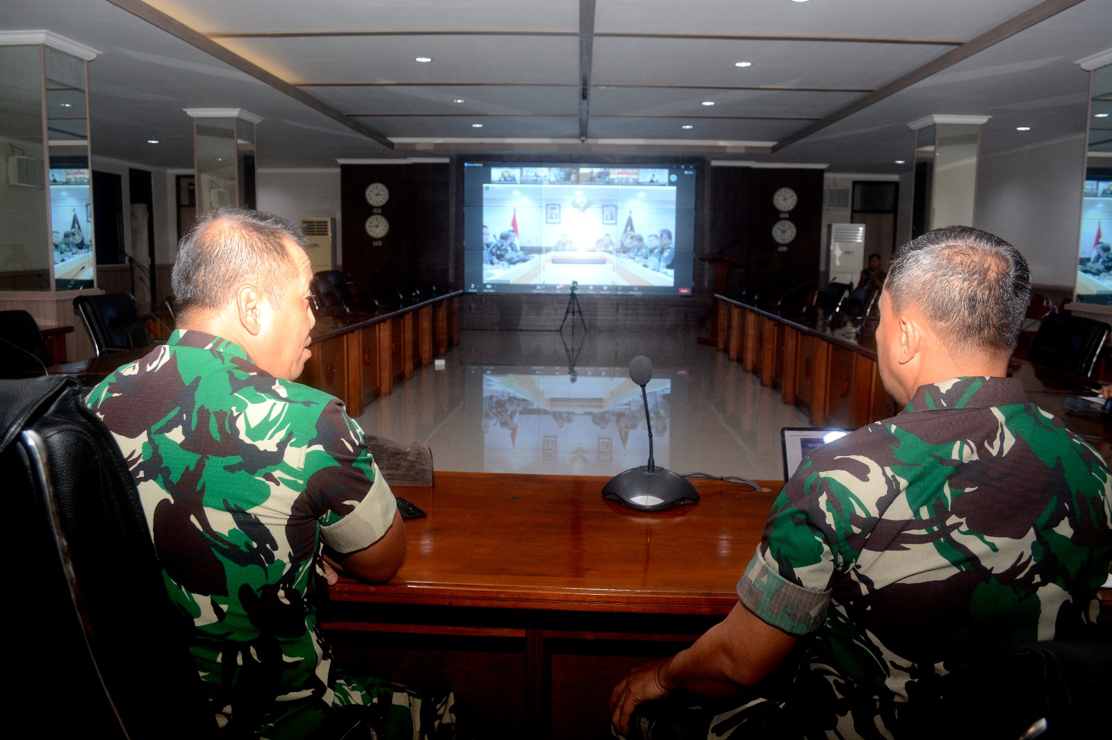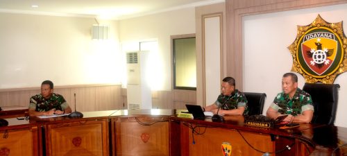 Denpasar – Kasdam IX/Udayana Brigjen TNI Sachono, S.H., M.Si., didampingi Aster Kasdam IX/Udayana Kolonel Inf Puji Hartono, S.I.P., dan Pabandya Wanwil Sterdam IX/Udayana Mayor Inf Gaguk Sumartono Y, S.Pd., mengikuti kegiatan Rapat Koordinasi Pembentukan Komponen Cadangan (Komcad) Matra Darat TA. 2023, secara virtual di Ruang Airlangga Makodam IX/Udayana, Denpasar, pada Senin (3/4/2023).