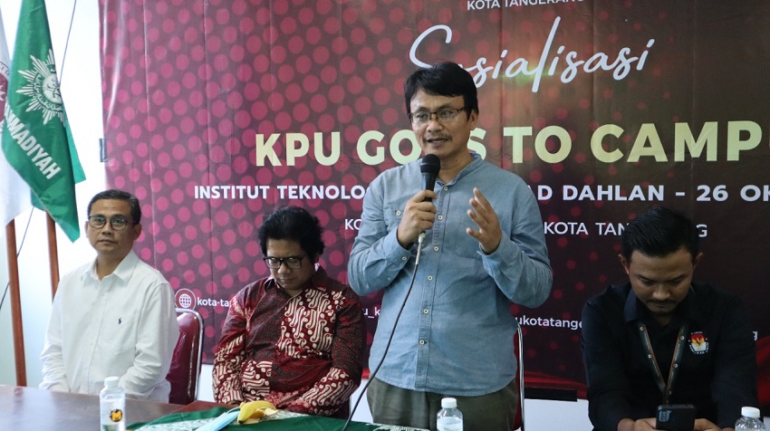 KOTA TANGERANG – Komisi Pemilihan Umum (KPU) Kota Tangerang gelar sosialisasi kepada para mahasiswa dan mahasiswi Kampus Institut Teknologi dan Bisnis Ahmad Dahlan (ITB AD), Karawaci, Kota Tangerang, Pada Rabu (26/10/2022). Sosialisasi yang rutin digelar oleh KPU Kota Tangerang ini dikenal dengan sebutan “KPU GOES TO CAMPUS”.