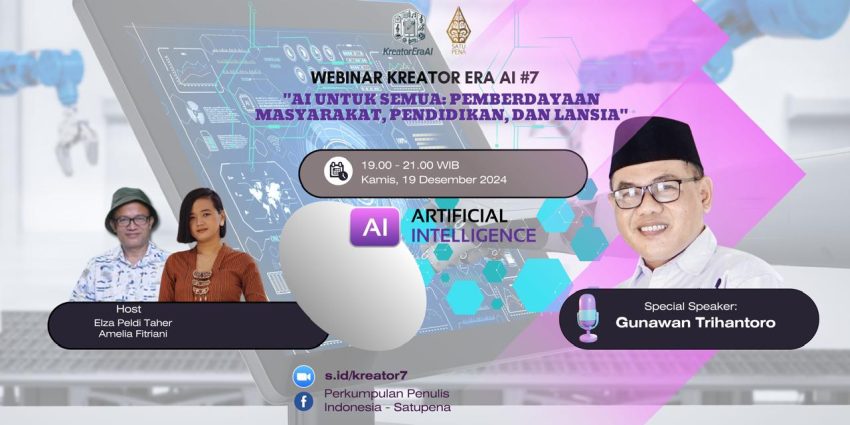 JAKARTA- Kreator Era AI bersama Perkumpulan Penulis Indonesia SATUPENA akan mendiskusikan tema “AI Untuk Semua: Pemberdayaan Masyarakat, Pendidikan, dan Lansia,” dengan narasumber pegiat sosial Gunawan Trihantoro.