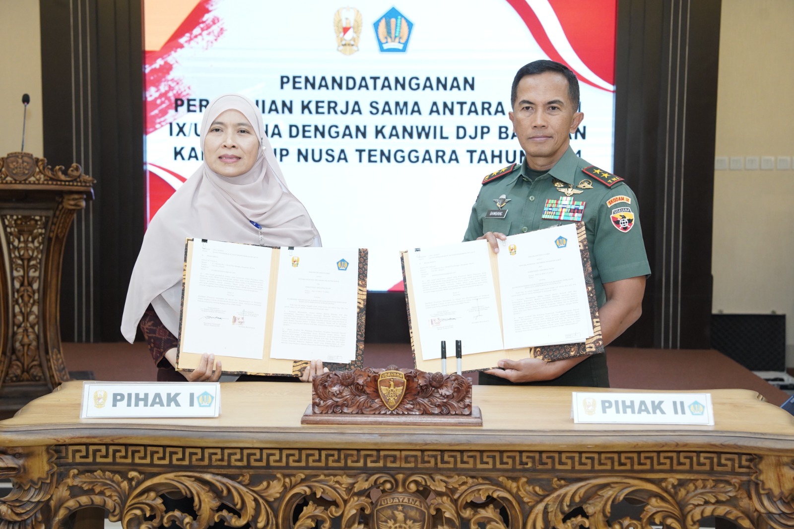 Acara Perjanjian Kerja Sama antara Direktorat Jenderal Pajak (DJP) Bali Nusra dengan Kodam IX/Udayana berjalan dengan tertib dan lancar serta diakhiri dengan penandatanganan Perjanjian Kerja Sama, penyerahan cenderamata dan foto bersama. (Pendam IX/Udy)