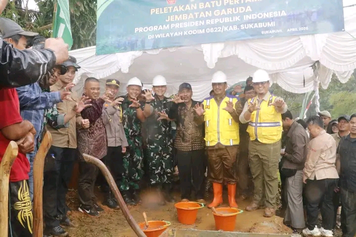 SUKABUMI — Bupati Sukabumi H. Asep Japar bersama Komandan Korem 061/Surya Kencana Brigjen TNI Thomas Rajunio dan Komandan Kodim 0622 Sukabumi Letkol Inf Agung Ariwibowo meresmikan sekaligus memulai pembangunan Jembatan Garuda di sejumlah titik di Kabupaten Sukabumi, Kamis (9/4/2026).
