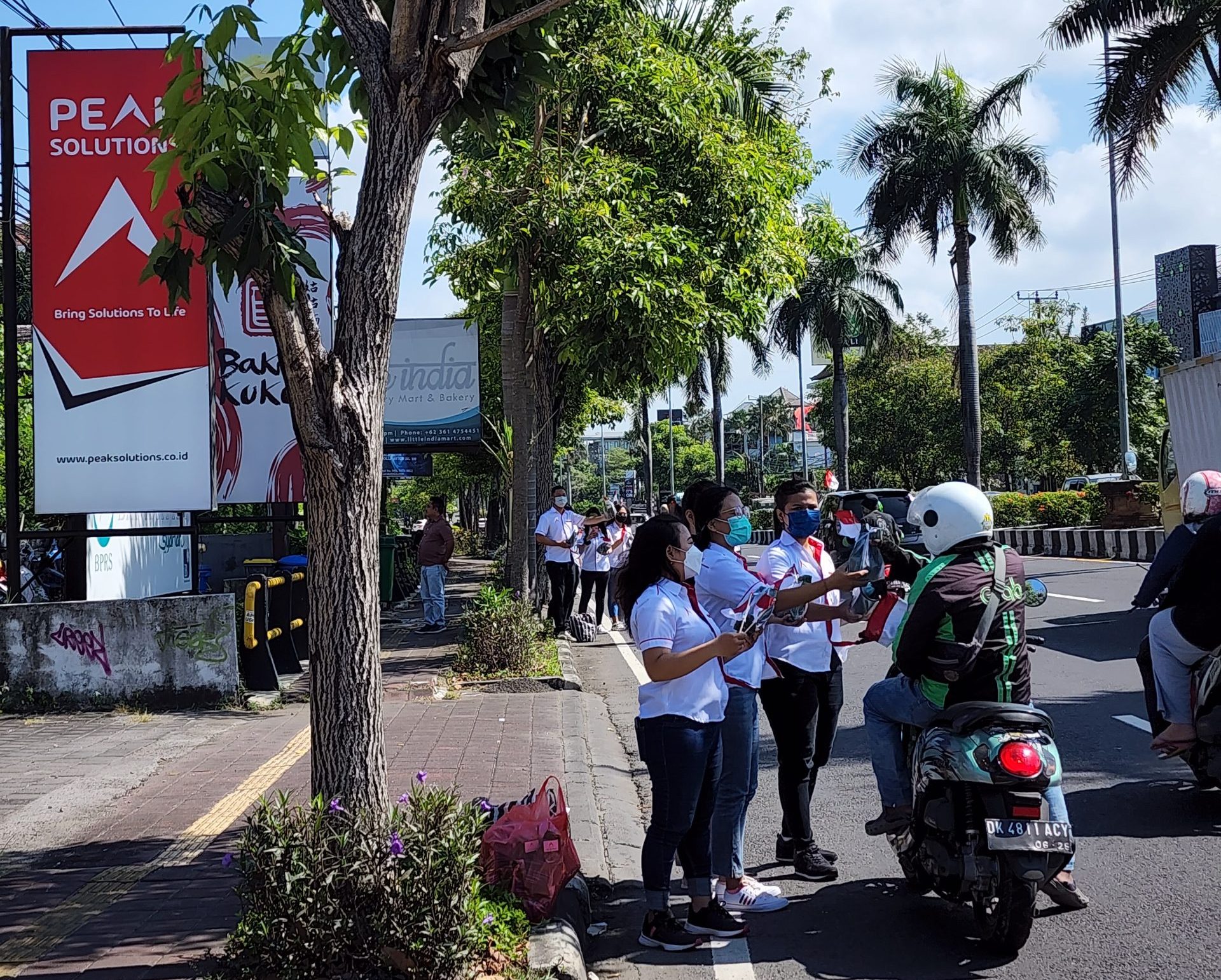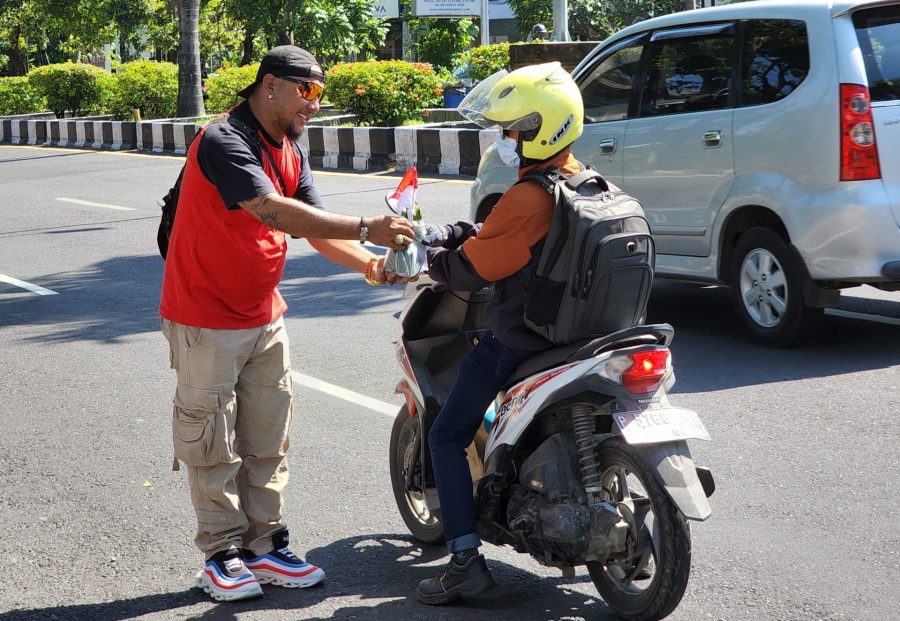 BALI – Dalam rangka menyambut Hari Kemerdekaan Republik Indonesia yang ke-77, PT Peak Solutions Group menggelar aksi bagi-bagi bendera dan nasi bungkus kepada para pengendara di Jalan Sunset Road, Kelurahan Seminyak, Kecamatan Kuta, Kabupaten Badung, Provinsi Bali, Senin (16/8/2022).