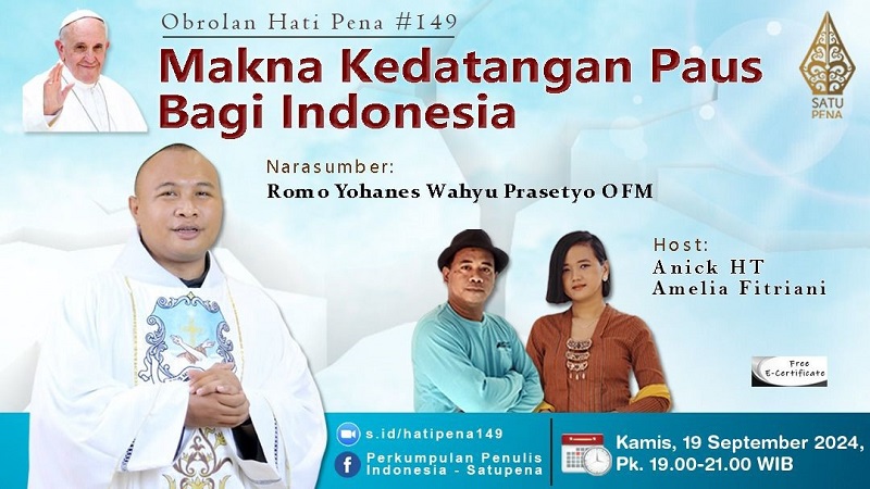 Obrolan Hatipena #149 yang membahas makna kedatangan Paus Fransiskus itu akan berlangsung di Jakarta, Kamis malam, 19 September 2024, pukul 19.00-21.00 WIB.