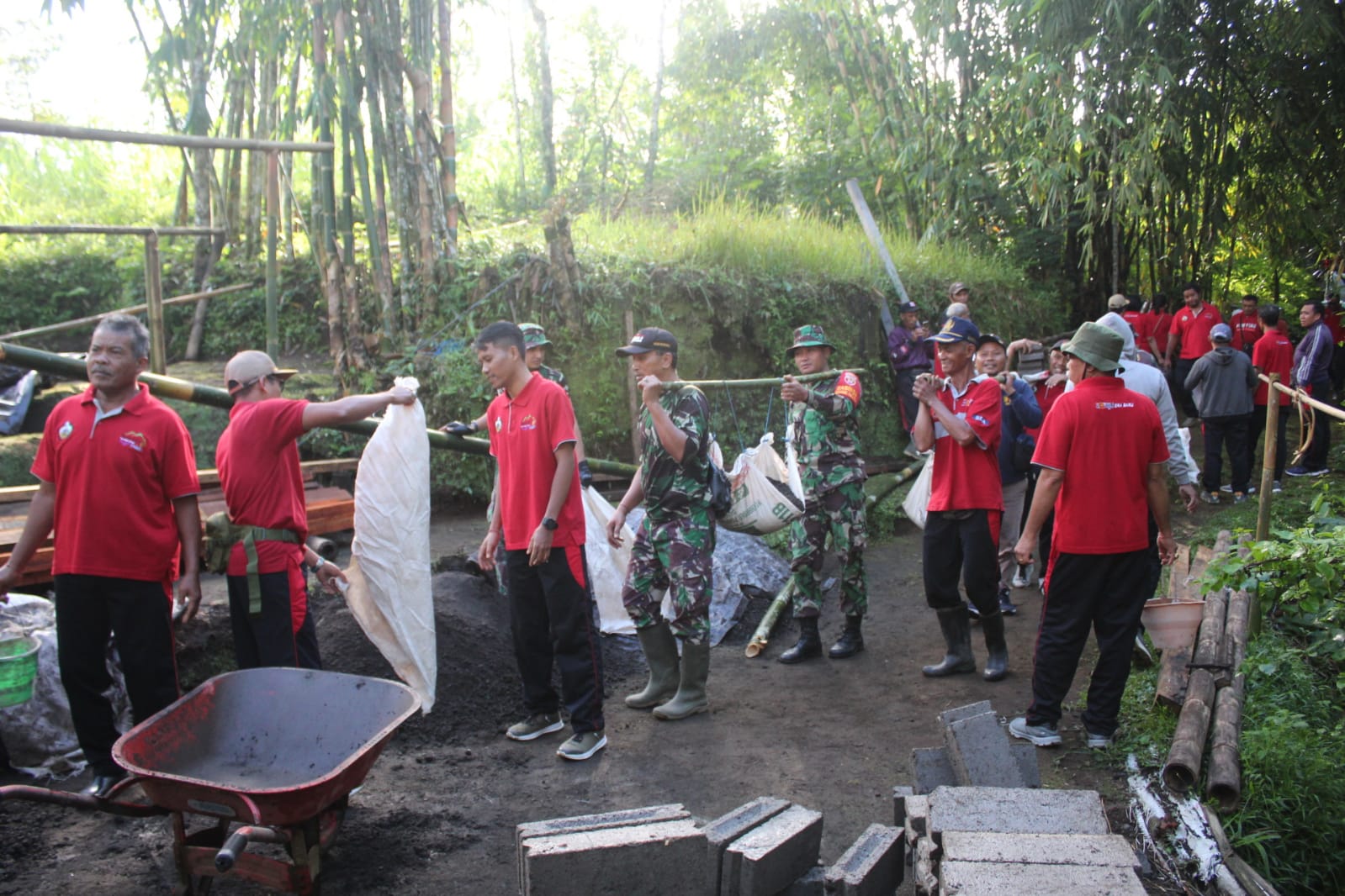 Dengan semangat gotong-royong, puluhan anggota Kodim 1626/Bangli bahu-membahu bersama masyarakat dan Pegawai Negeri Sipil di lingkungan Dinas PUPR Perkim Pemerintah Daerah Kabupaten Bangli melaksanakan pengangkutan material bahan bangunan berupa pasir dan batako, pada Jumat (10/3/2023).