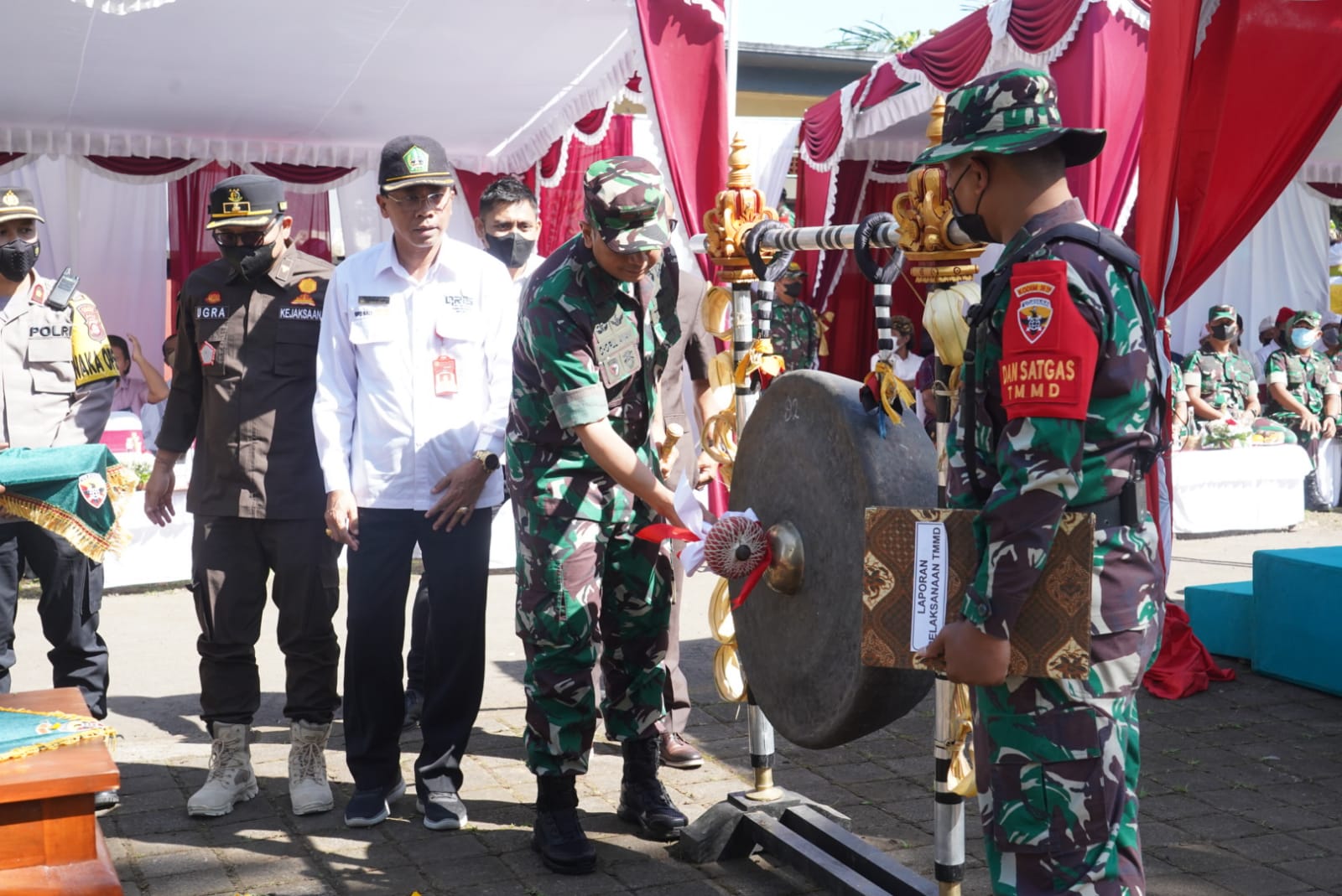 TABANAN – Danrem 163/Wira Satya Brigjen TNI Choirul Anam, S.E., M.M., memimpin upacara penutupan TMMD (TNI Manunggal Membangun Desa) ke 114 tahun 2022 yang ditandai dengan penandatanganan naskah serah terima hasil TMMD dan pemukulan gong, bertempat di Halaman Pura Luhur Muncak Sari, Desa Sangketan, Kecamatan Penebel, Kabupaten Tabanan, pada Rabu (24/8/2022).