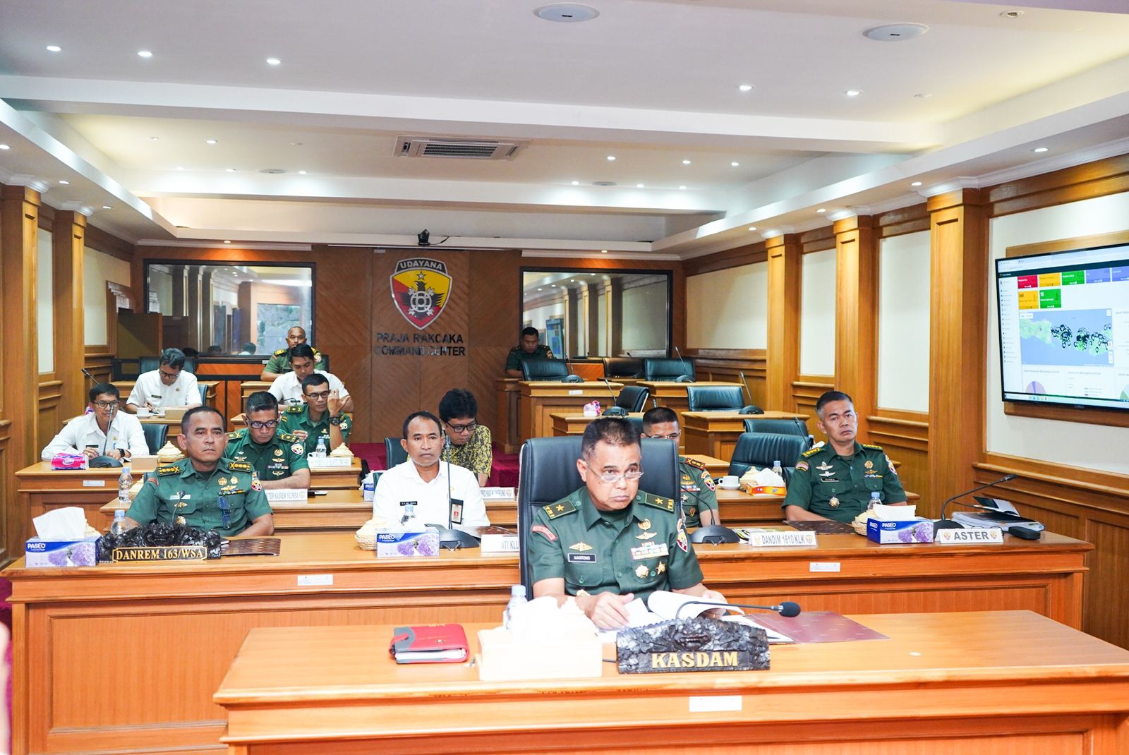 Denpasar – Kepala Staf Kodam IX/Udayana, Brigjen TNI Hartono, S.I.P., mengikuti kegiatan Rapat Koordinasi Teknis (Rakornis) TNI Manunggal Membangun Desa (TMMD) ke-121 TA. 2024 yang dilaksanakan secara Video Conference di Command Center Soekertijo, Makodam IX/Udayana, Denpasar, pada Rabu 10 Juli 2024.