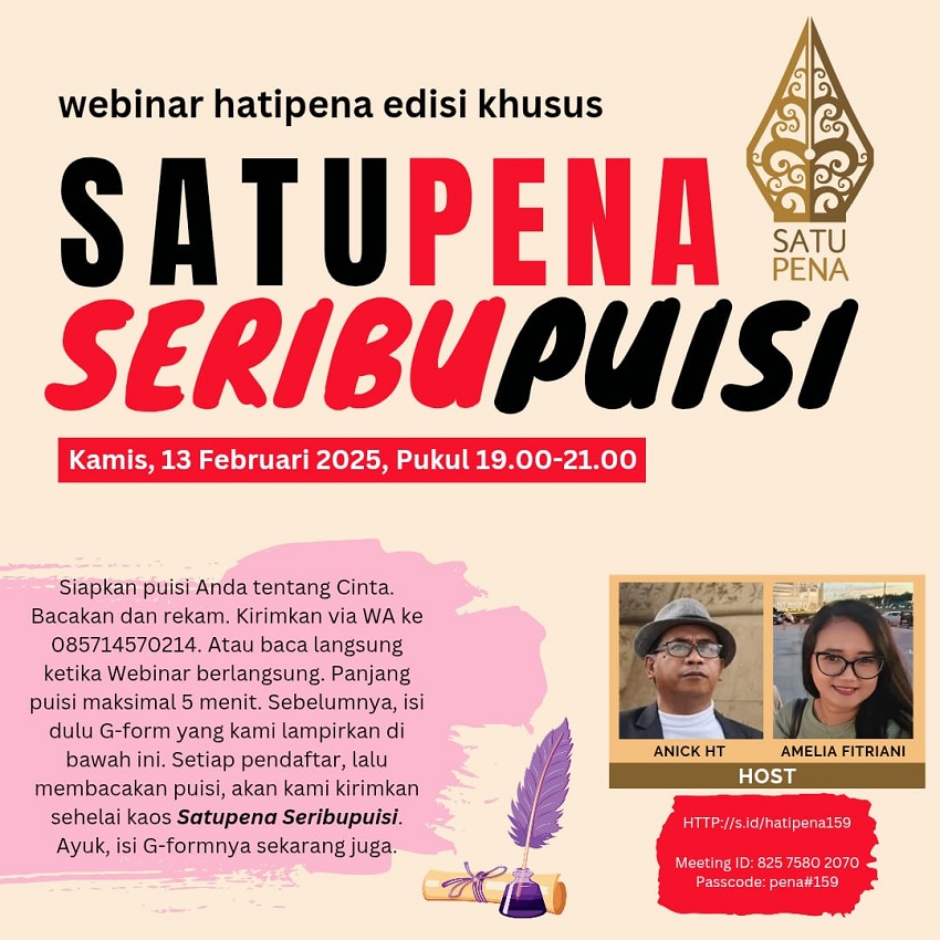 Acara baca puisi ini bisa diikuti di link zoom: https://s.id/hatipena159. Selain itu, lewat Facebook Channel: Perkumpulan Penulis Indonesia – Satupena. Disediakan sertifikat bagi yang membutuhkan.